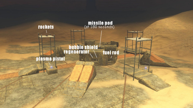 ::download map variant:: ::download gametype:: This is the human holdout, with weapons/equipment as labeled. Weapons/equipment/layout are symmetrical on two axis, so there are 4 of everything (except for the 1 missile pod). There are unlimited plasma/firebomb grenades on the center platform.