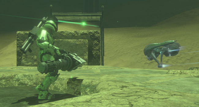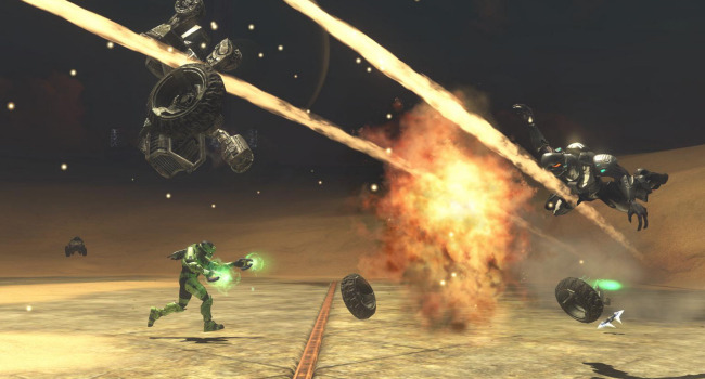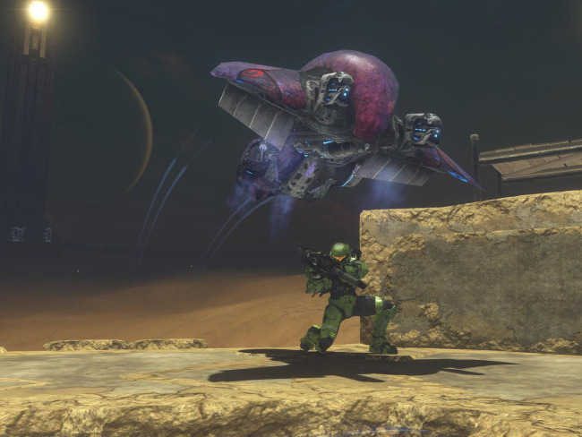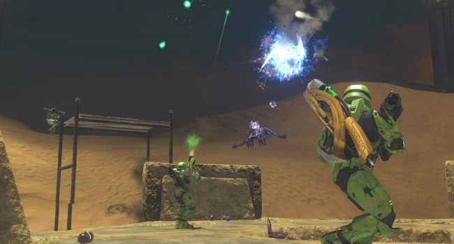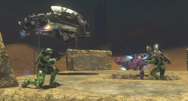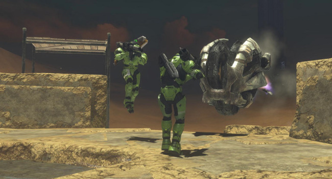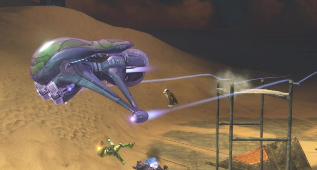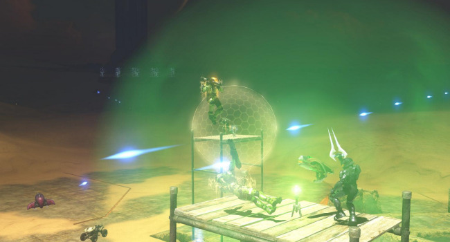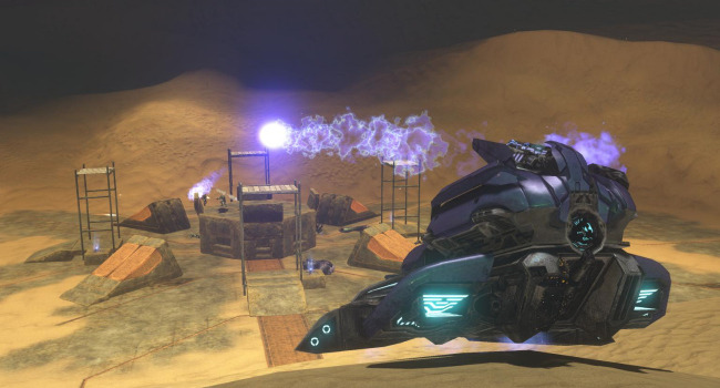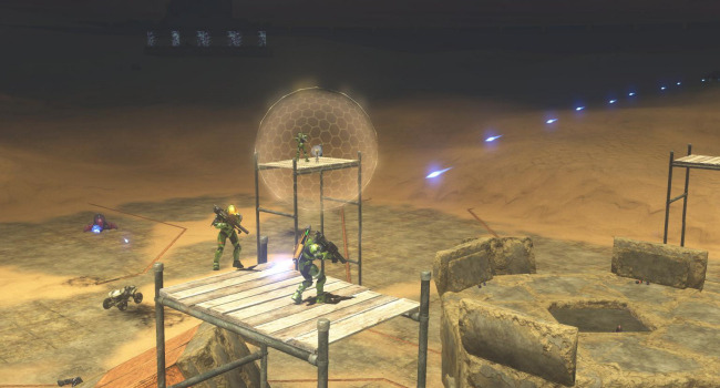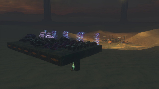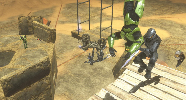 The vehicles here have delayed spawns, beginning with mongeese that are available at the beginning of the round. Every 30 seconds a new vehicle type will spawn in the order of: ghosts, choppers, warthogs, banshees, and finally a single wraith. Spawn weapon is, of course, the sword. The zombies have slow movement speed to encourage them to use vehicles. They have no shields but have enough of a health boost to compensate. Their spawn is elevated to prevent humans from stealing their vehicles. If you accidentally fall off the platform without a vehicle, walk into the teleporter below to die (it is a better alternative than slowly walking all the way to the humans).