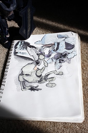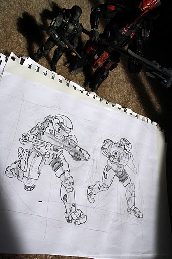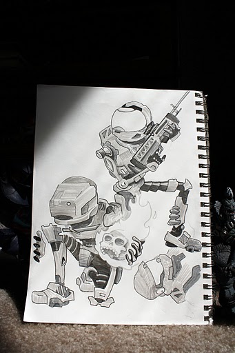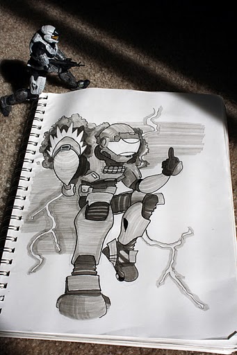 hello, HBO'ers. I lurk on here everyday, but very very rarely post. Well, long story short, I saved up enough Cr the other day, to FINALLY buy my inclement weather, or as my friends and I call them, thunder pants. So I did what I always do to celebrate something, i drew a picture. And I just had to share it with you guys. When photographing this drawing, I decided to shoot some of my other drawings and see what you guys thought of them. These are mostly sketches i do after a fun night of halo. They take anywhere from 30 mins to an hour and a half. I use ink pens and grayscale brush pens for the more finished ones. I know they don't hold a candle to some of the other art work here (fist full of arrows, i'm looking at you) but i thought you guys would appreciate some fun, quick drawings. oh, and if you want high resolutions of these drawings, visit my picasa. [small images localized, linked to picasa pages -lwu]