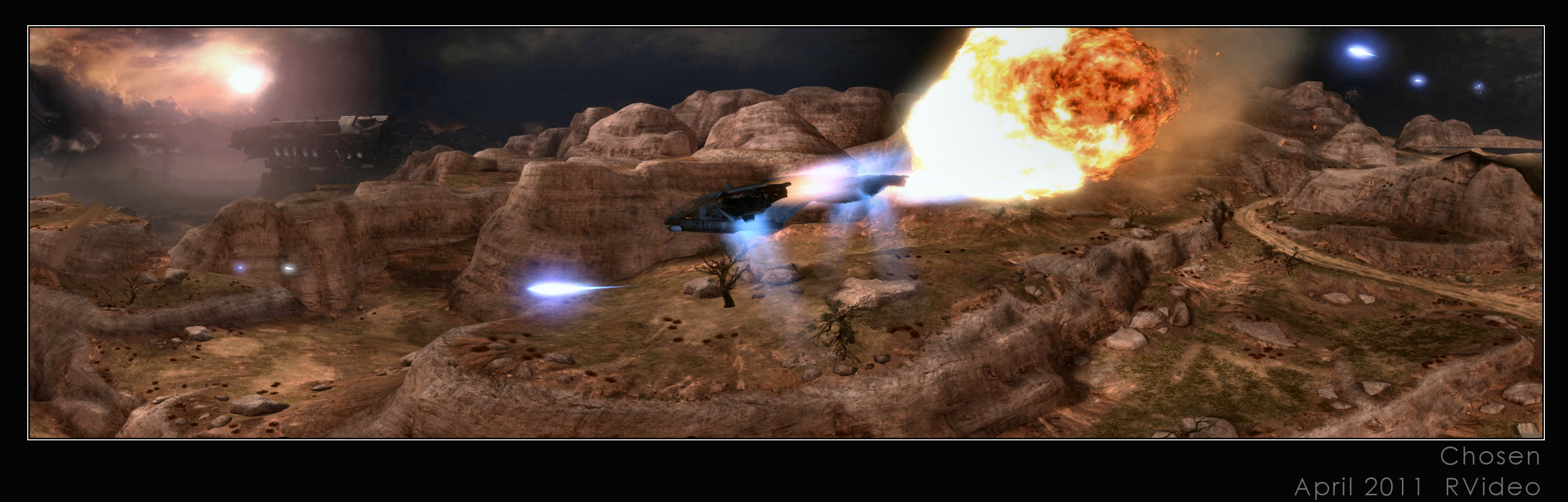 This one is from the scene where Carter sacrifices himself to save the "transport" team. Carter's pelican deploys what appear to be max reverse thrusters or engine brakes. In the actual scene, the Pelican simply disappears from the stage (behind the view of the hills and therefore the player perspective). If you look closely with zoom you can sort of see this, barely.