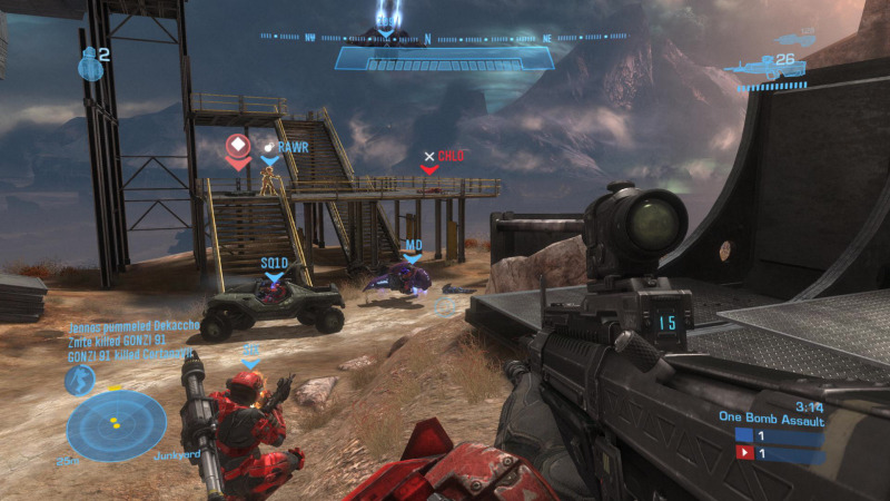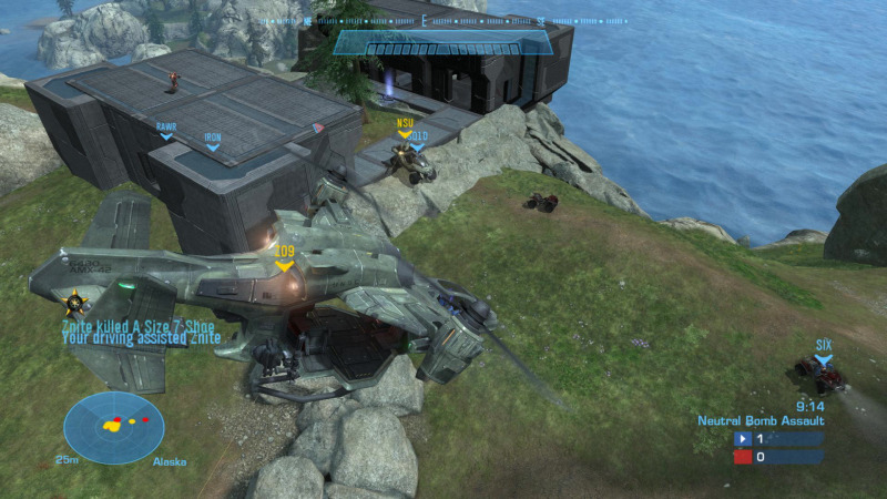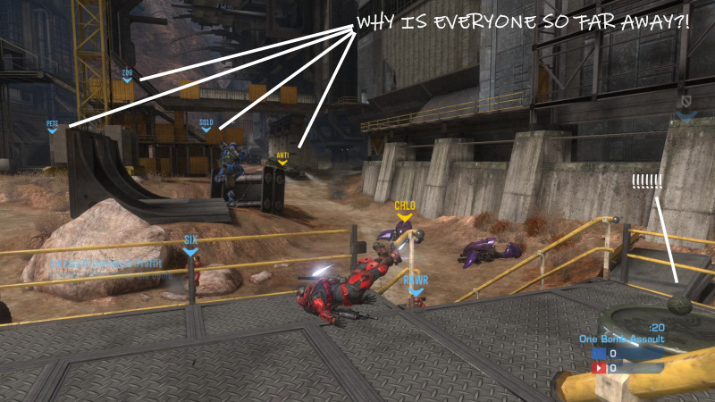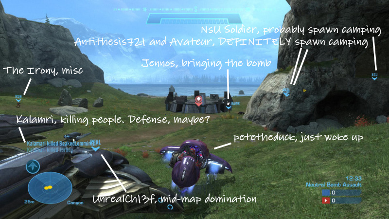 8:16 - Team HBO wins against Team Born Yesterday, 3-0. ::::::::::::::::::::::::::::::::::: Intermission! Our party of 8 jumped into another matchmaking playlist; it was HBO vs. HBO for a game of Team Snipers on Reflection and Snipers Pro on Highlands. Don't worry, Team HBO won both times. Refreshed, we took The World in Game 4: Elite Slayer on Hemorrage, 100-86. ::::::::::::::::::::::::::::::::::: Game 5: One Bomb Assault on Boneyard - Hogtacular. I was standing on top of the bomb, wondering why I could not pick it up. Then I realized: we're on defense. At least the rest of Team HBO knew what to do: the Warthog Contingency was enacted.